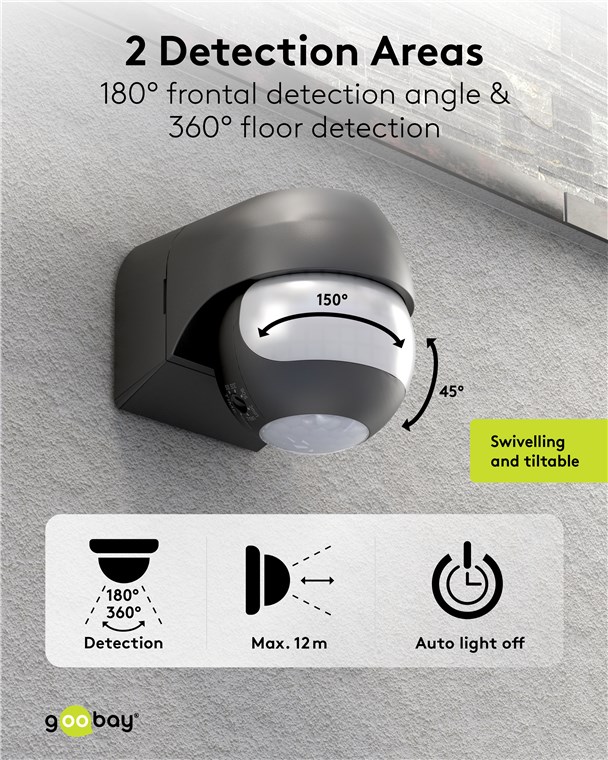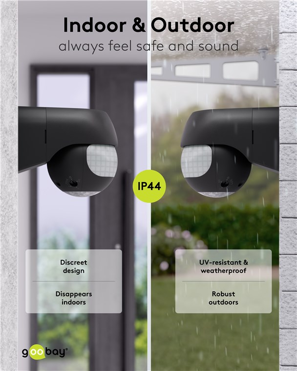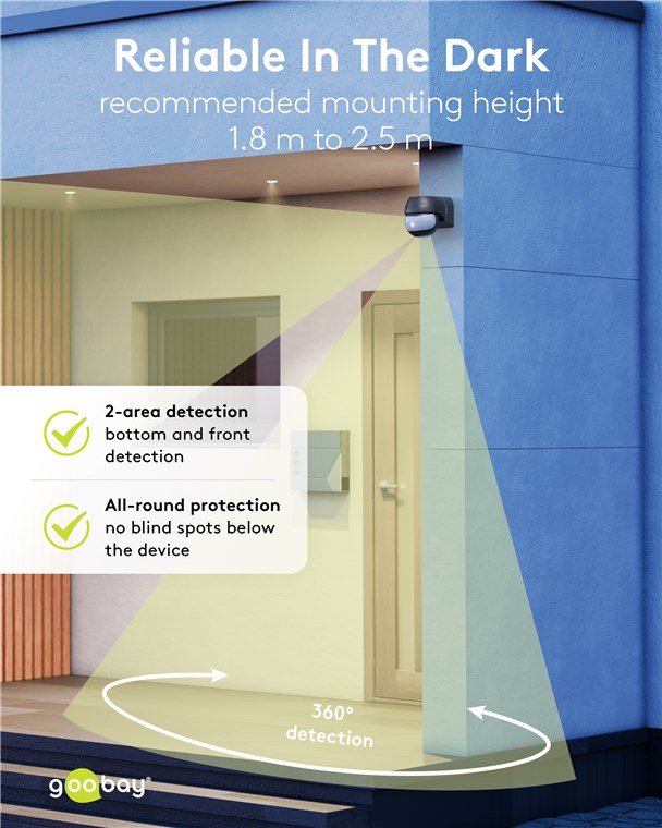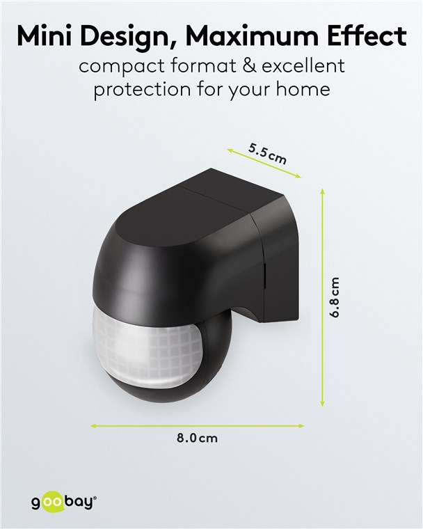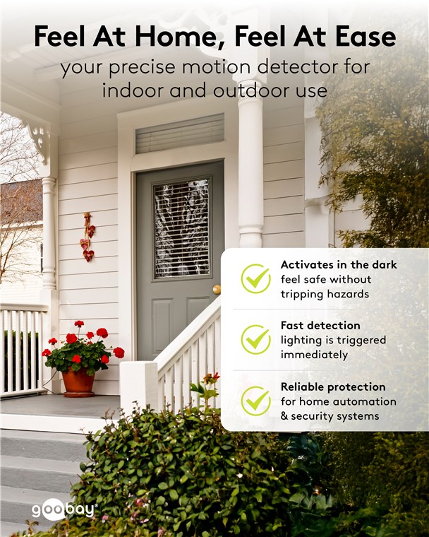 Wind und Wetter? Kein Problem, der Bewegungsmelder ist mit IP44 perfekt für Außenbereiche wie Garten, Carport oder Hauseingänge. Die 2 Infrarot-Sensoren reagieren auf Bewegungen aus horizontaler Richtung und aus dem Bereich unterhalb des Gerätes, daher ist der Bewegungsmelder besonders praktisch für eine erhöhte Installation. Bewegungsmelder von Goobay – mit Sicherheit ein gutes Gefühl.