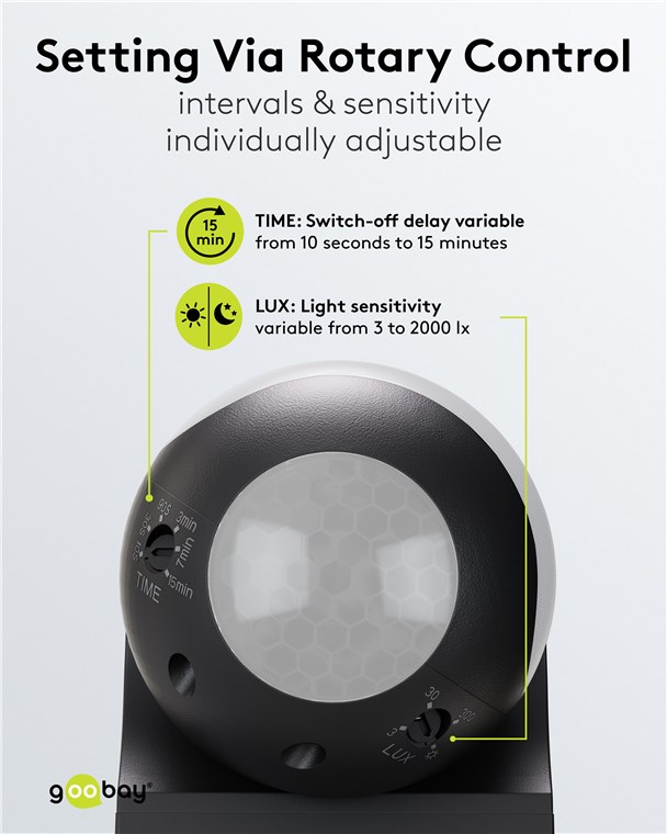 - Lichtempfindlichkeit (3 lx bis 2000 lx) und Abschaltverzögerung (10 s bis 15 min) lassen sich einfach und stufenlos per Drehregler auf der Unterseite einstellen