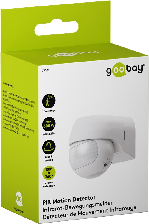 Wind und Wetter? Kein Problem, der Bewegungsmelder ist mit IP44 perfekt für Außenbereiche wie Garten, Carport oder Hauseingänge. Die 2 Infrarot-Sensoren reagieren auf Bewegungen aus horizontaler Richtung und aus dem Bereich unterhalb des Gerätes, daher ist der Bewegungsmelder besonders praktisch für eine erhöhte Installation. Bewegungsmelder von Goobay – mit Sicherheit ein gutes Gefühl.