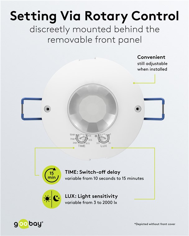 - Dezenter Look, komfortable Bedienung: Die Drehregler für Lichtempfindlichkeit und Abschaltverzögerung liegen unter der abnehmbaren Blende, um die Einstellungen jederzeit anzupassen – ohne Ausbauen, ohne Werkzeug
