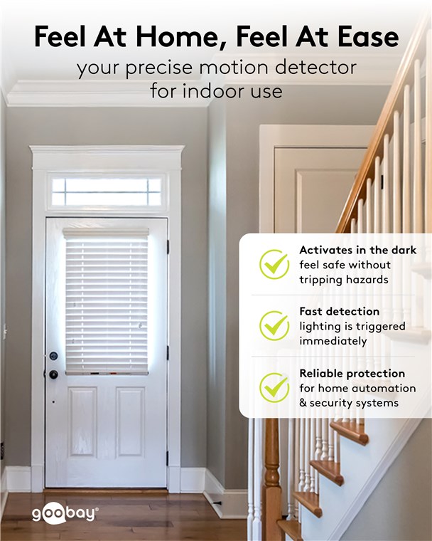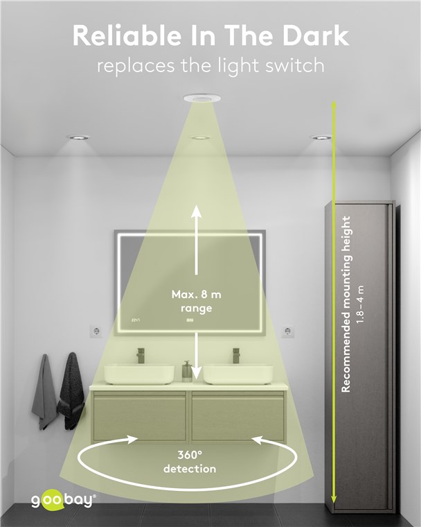 - Ersetzt den Lichtschalter und schaltet berührungslos: Besonders praktisch in Räumen, die mit vollen Händen betreten werden, z. B. Flure oder Hauswirtschaftsräume