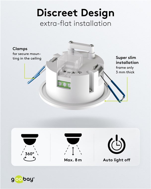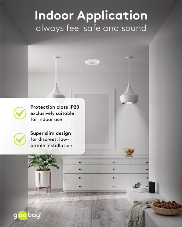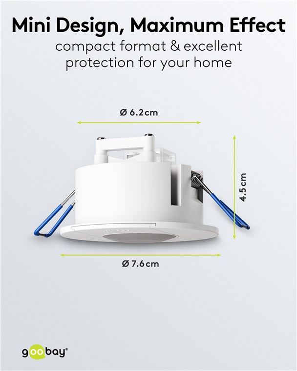 Clever und kompakt: Der Bewegungsmelder hat einen Durchmesser von 7,6 cm und ragt nur ca. 5 mm aus der Decke heraus. Damit ist er die superflache Option unter den Bewegungsmeldern und perfekt für die unauffällige Installation. Die weiße Blende verdeckt die Drehregler, über die du ganz einfach Lichtempfindlichkeit und Abschaltverzögerung einstellen kannst – auch nach der Installation.
