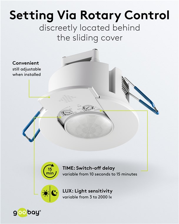 - Dezenter Look, komfortable Bedienung: Die Drehregler für Lichtempfindlichkeit und Abschaltverzögerung liegen unter der verschiebbaren Blende, um die Einstellungen jederzeit anzupassen – ohne Ausbauen, ohne Werkzeug