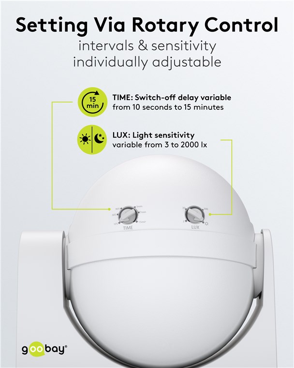 - Lichtempfindlichkeit (3 lx bis 2000 lx) und Abschaltverzögerung (10 s bis 15 min) lassen sich einfach und stufenlos per Drehregler auf der Unterseite einstellen