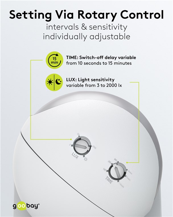 - Lichtempfindlichkeit (3 lx bis 2000 lx) und Abschaltverzögerung (10 s bis 15 min) lassen sich einfach und stufenlos per Drehregler auf der Unterseite einstellen