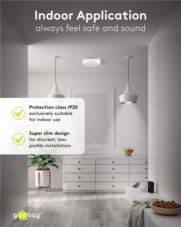 - Mit einem Erfassungswinkel von 360° ideal für die Aufputz-Deckenmontage, Installationshöhe: 2,20 m bis 4 m