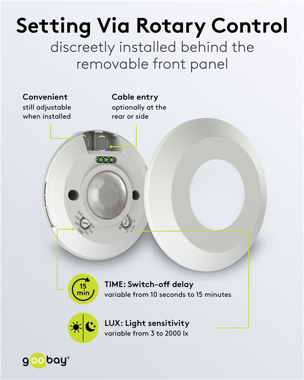 - Lichtempfindlichkeit (3 lx bis 2000 lx) und Abschaltverzögerung (10 s bis 15 min) lassen sich hinter der abnehmbaren Blende einfach und stufenlos per Drehregler einstellen