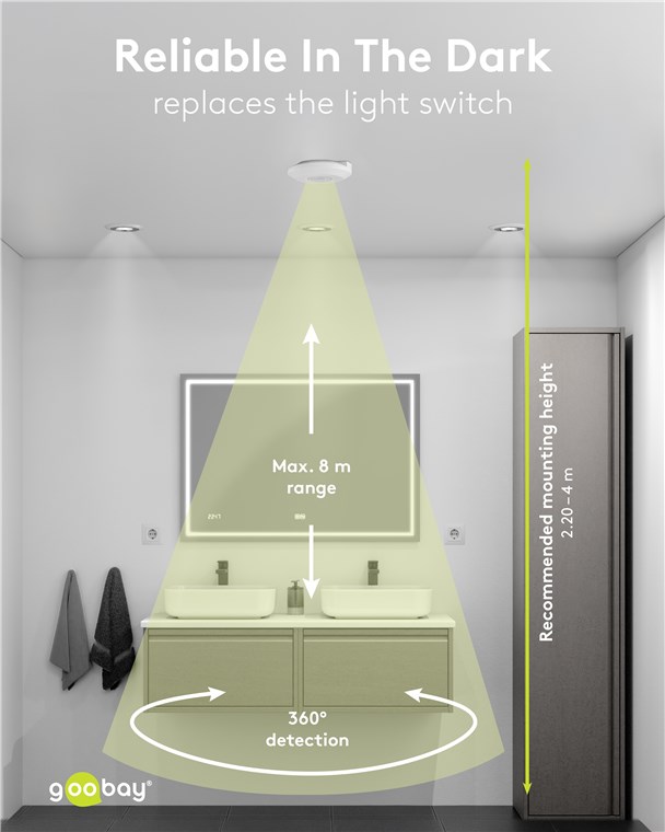 - Ersetzt den Lichtschalter und schaltet berührungslos: Besonders praktisch in Räumen, die mit vollen Händen betreten werden, z. B. Flure oder Hauswirtschaftsräume