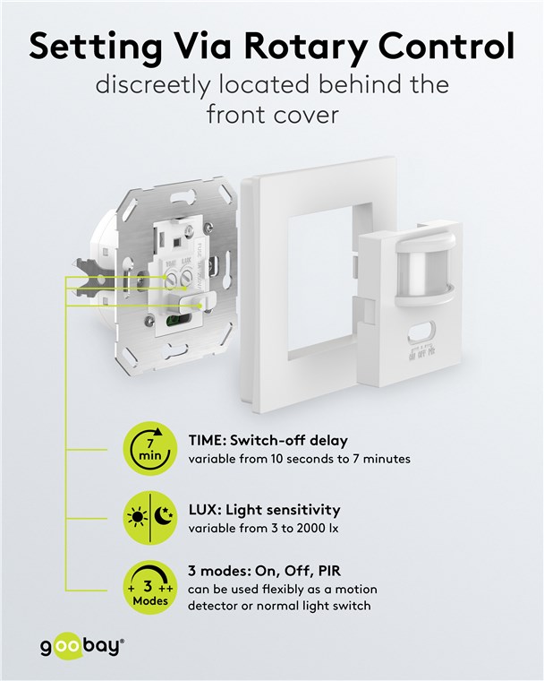 - Lichtempfindlichkeit (3 lx bis 2000 lx) und Abschaltverzögerung (10 s bis 7 min) lassen sich hinter der Blende einfach und stufenlos per Drehregler einstellen