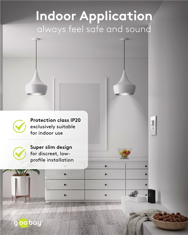 - Ersetzt den Lichtschalter und schaltet berührungslos: Besonders praktisch in Räumen, die mit vollen Händen betreten werden, z. B. Flure oder Hauswirtschaftsräume