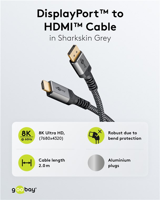 Die Goobay Plus Serie im schlanken, edlen Metalldesign in Sharkskin Grey. Die komfortable Lösung, um eine DisplayPort™-Quelle mit einem Fernseher oder Monitor mit HDMI™-Anschluss zu verbinden - für ein gestochen scharfes Bild mit bis zu 8K und ein immersives Klangerlebnis über Geräte ohne eigenen DisplayPort™-Anschluss.