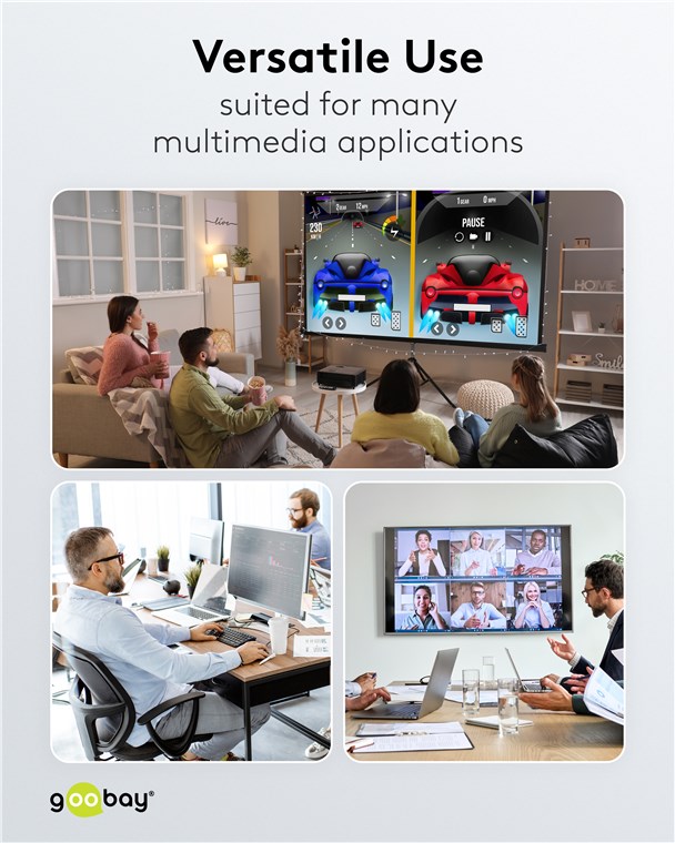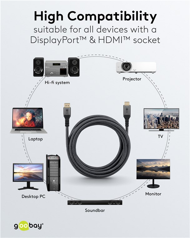 - Das Kabel erreicht mit DisplayPort™ 2.0/2.1 und HDMI™ Ultra HD-Auflösungen von bis zu 8K @ 50/60 Hz und eine Datentransferrate von max. 48 Gbit/s