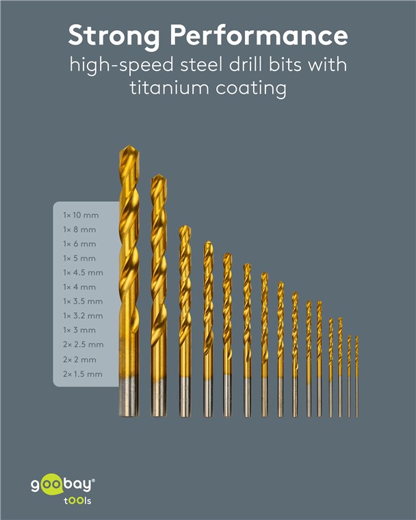 - 15x Metallbohrer aus Hochgeschwindigkeitsstahl (HSS) mit Titan-Beschichtung und den Durchmessern 2x 1,5 mm, 2x 2 mm, 2x 2,5 mm, 3 mm, 3,2 mm, 3,5 mm, 4 mm, 4,5 mm, 5 mm, 6 mm, 8 mm, 10 mm