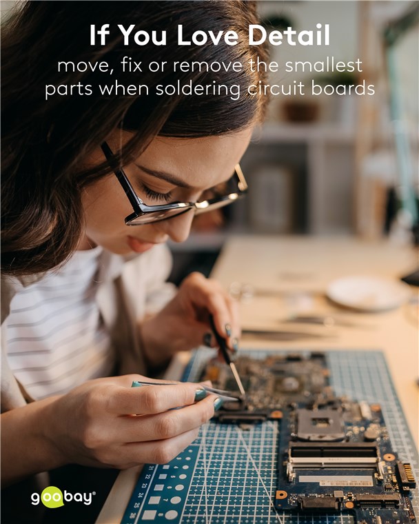 - Praktisches, doppelseitig bestücktes Lötbesteck zum Bearbeiten von Leiterplatten, Reinigen von kleinen Metallteilen, Präzisionsarbeiten wie Schmuckreparatur, Modellbau etc.