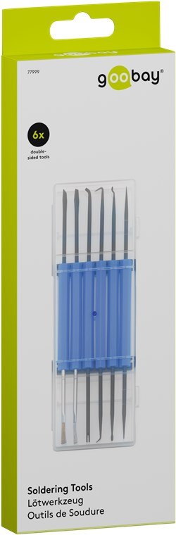 - 2x Chiphalter, 1x Reibahle mit rundem Querschnitt zum Säubern von Platinenlöchern, 1x Hebel und 1x Haken zum Heraushebeln von Platinenteilen, 2x spitze Schaber zum Entfernen von Korrosion