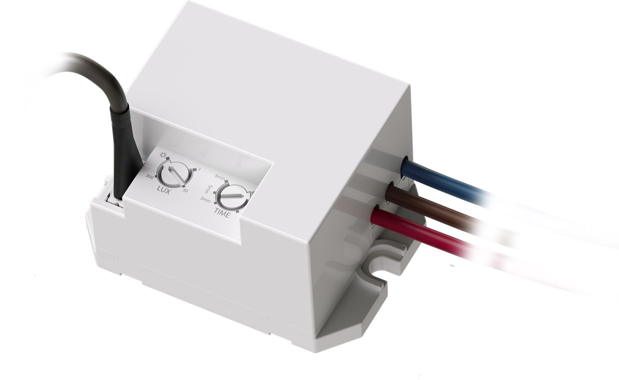 - Lichtempfindlichkeit (3 lx bis 2000 lx) und Abschaltverzögerung (10 s bis 8 min) lassen sich hinter der Blende einfach und stufenlos per Drehregler einstellen