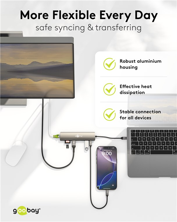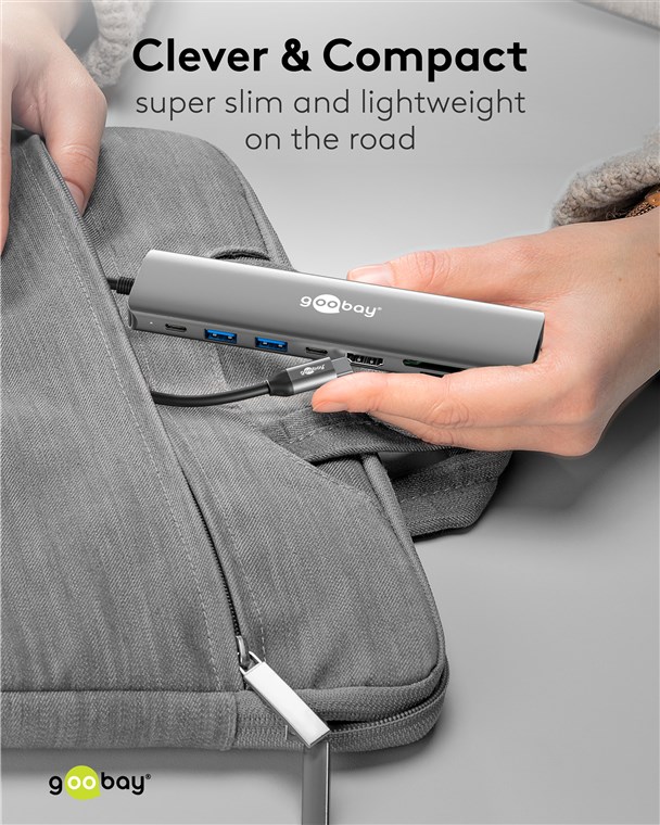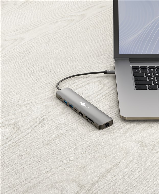 Maximale Konnektivität für jedes Tablet, Smartphone oder Laptop über nur einen USB-C™-Port: Mit dem Hub verbindest du deine Speicherkarten, HDMI™- und USB-Geräte ganz einfach über den USB-C™-Port deines Laptops. Selbst ein Netzwerkkabel kannst du so über USB verbinden. Superpraktisch, wenn dein Laptop nicht über einen eigenen RJ45-Port verfügt und du dich nicht auf WLAN verlassen möchtest. Schnell verkabeln, sicher streamen!