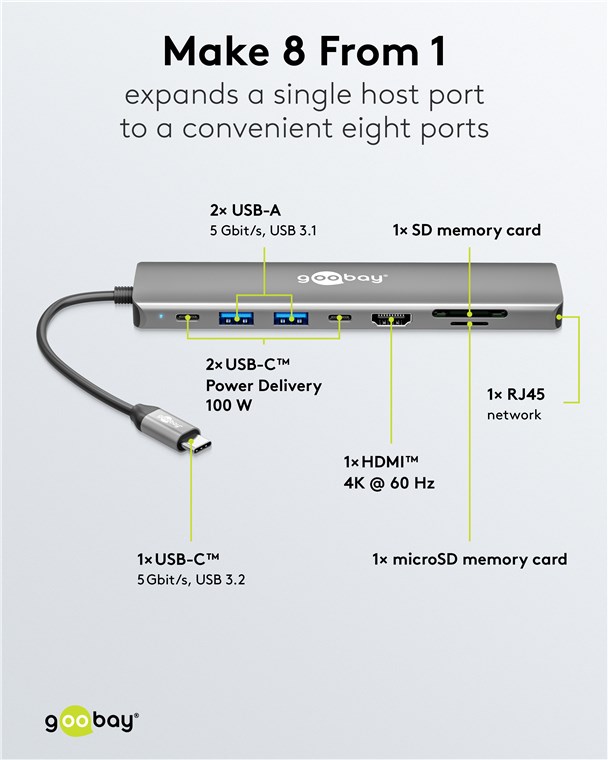 - Der praktische USB-C™-Hub erweitert einen einzelnen USB-Geräteport auf acht Anschlüsse: Ein Tablet- oder Laptop-Port kann so bis zu acht Peripheriegeräte bedienen