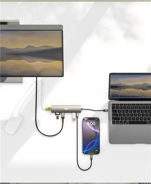 - Über die USB-A-Anschlüsse unterstützt der Hub Datenraten bis zu 5 Gbit/s (USB 3.0), über die USB-C™-Ports 1x Power Delivery mit 100 W (nur Strom) und 1x Datenraten von 480 Mbit/s