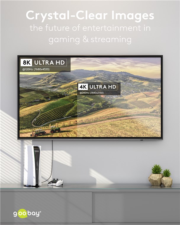 - 8K-Kabel speziell für den Gaming-Bereich. Flüssige Bilder ohne Ruckeln durch hohe Bildwiederholungsraten bis zu 240 Hz (abhängig von Grafikkarte und Monitor)