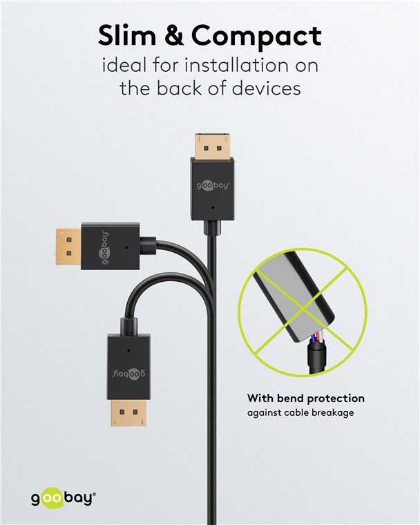 - Ultraslim-Design mit kurzem Stecker und Knickschutz sowie kleinem Biegeradius für den Anschluss auf beengtem Raum, z. B. an Geräterückseiten vor Wänden oder in Möbeln