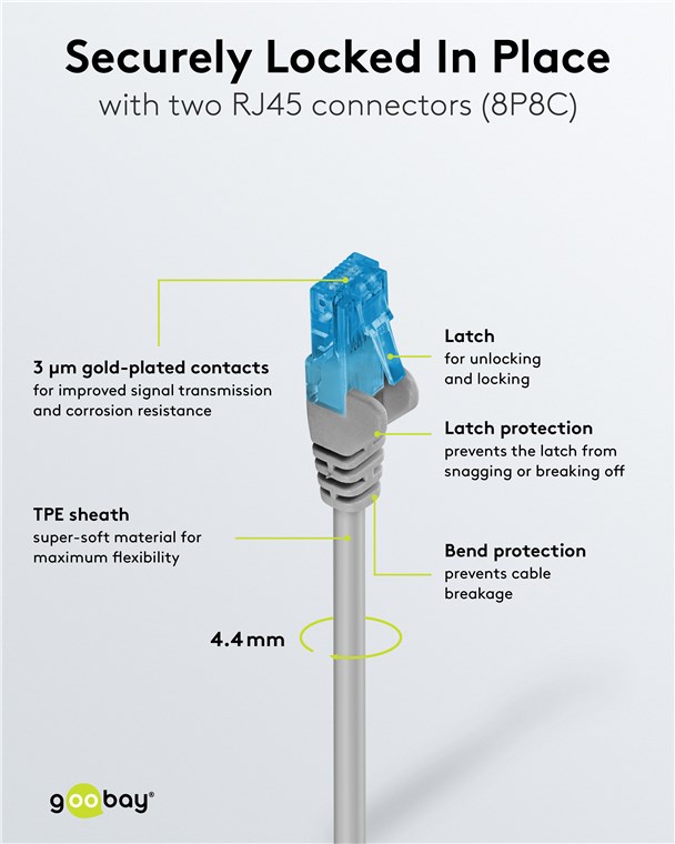 • Sicher eingerastet: Der Rastnasenschutz am RJ45-Stecker verhindert das Verhaken oder Abbrechen der Rastnase