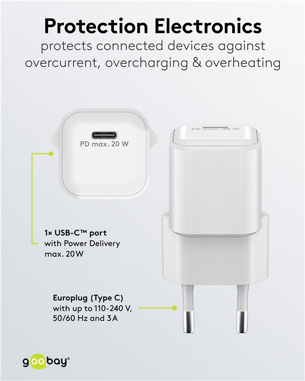 - Die integrierte Schutzelektronik des USB-C™-Ladegeräts sichert angeschlossene Geräte gegen Überstrom, Überladung und Überhitzung