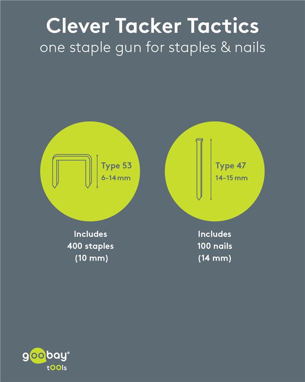 - The tacker fires approx. 20 staples per minute and is compatible with type 53 staples (length 6-14 mm) and type 47 nails (length 14-15 mm)