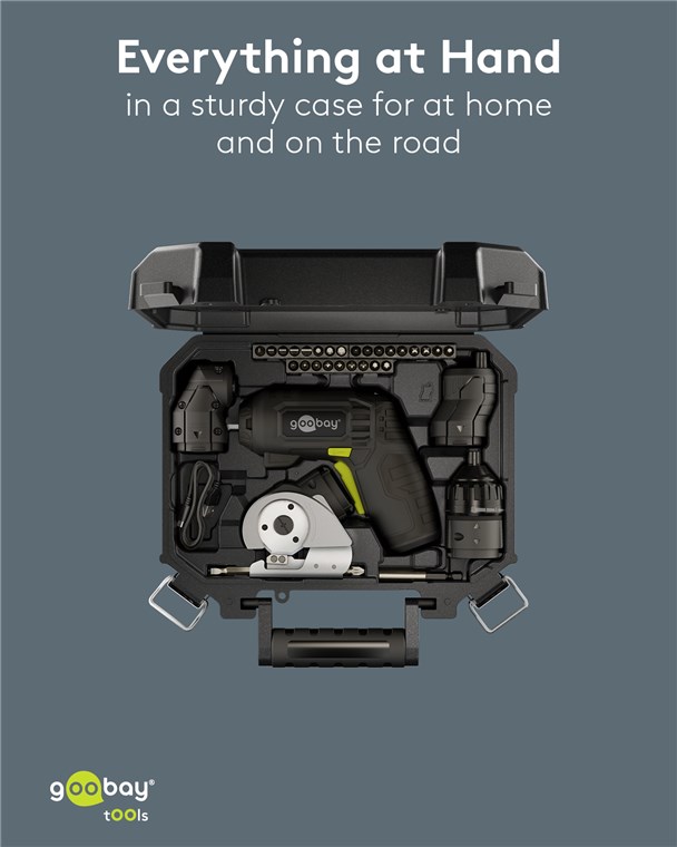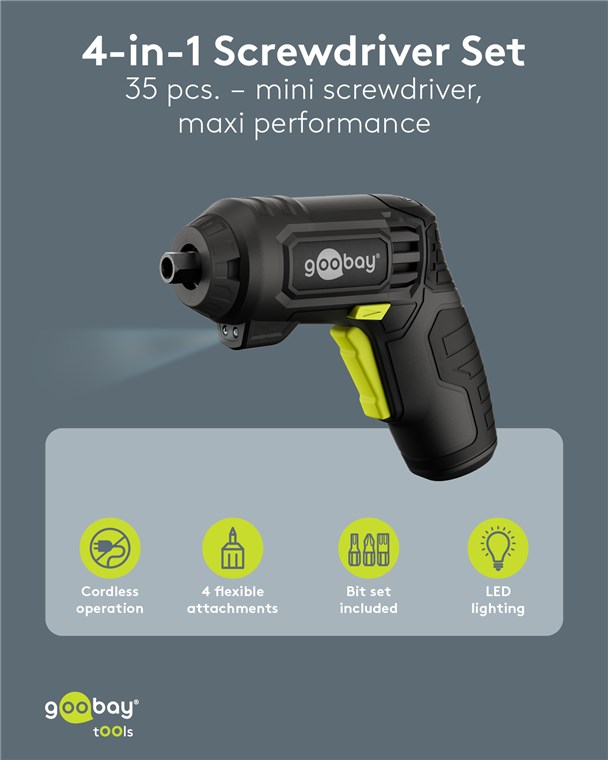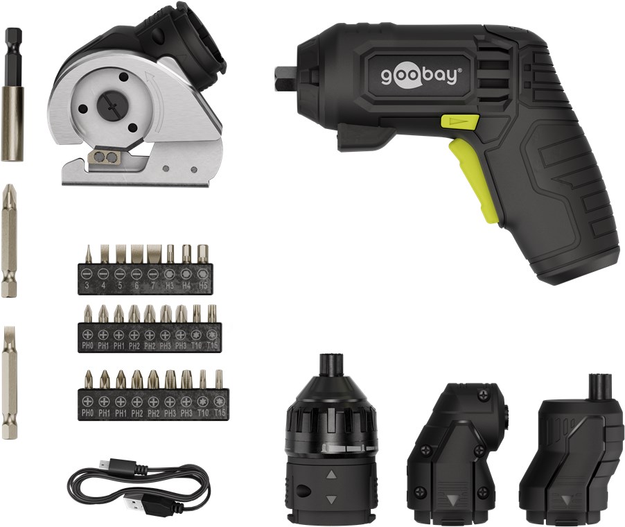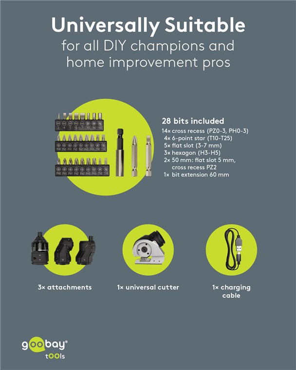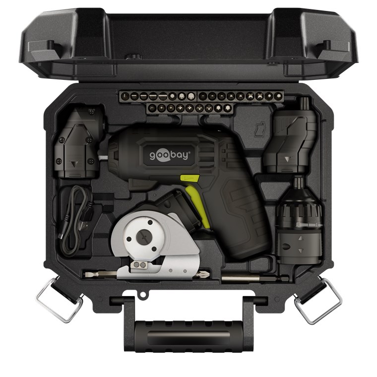 27 bits, 4 different attachments, bit extension, charging cable USB-Câ„¢ to USB-A, Cordless screwdriver, storage box