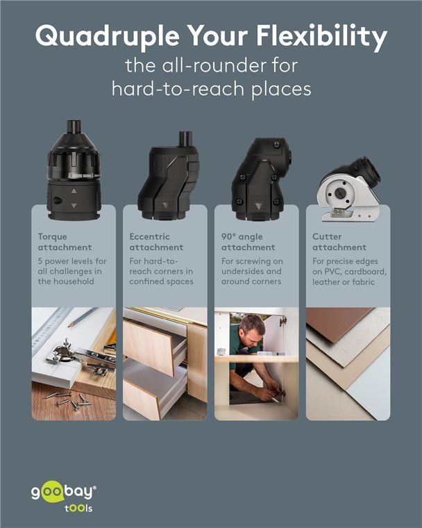 - 4 flexible attachments for hard-to-reach places: 1x 90° angle attachment, 1x eccentric attachment (offset bit holder for corners), 1x attachment with 5 torque settings, 1x universal cutting attachment