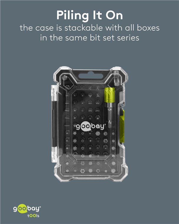 Every bit's a hit: The tool set impresses with its variable bits, bit holder and handy transport box. The convenient quick-release function of the bit holder allows for lightning-fast bit changes. The special shape with rubberised corners and a robust closure makes the box particularly durable. The highlight: the boxes in this product series can be stacked on top of each other. Clever design, safe transport.