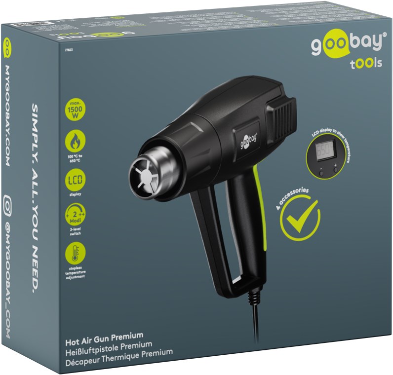 with LCD display, two continuously adjustable temperature intervals and four different nozzles