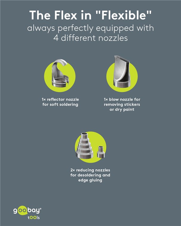 The hot air gun is the hottest tip in the DIY sector. Flexible in use with four different nozzles, it is the handy helper for numerous repair jobs and crafts, e.g. for extending cables with heat-shrink tubing and for desoldering and reshaping thin metal or plastic pipes.