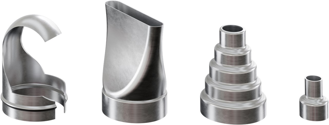 - Four nozzles included: 1x flat spray nozzle for removing stickers or paint stripping, 1x shovel-shaped reflector nozzle for soft soldering, 2x narrow reduction nozzles for desoldering or edge gluing