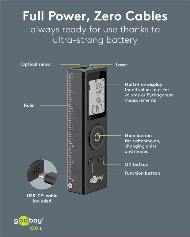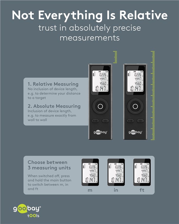 Precision at the touch of a button: The laser distance measure is the perfect helper for renovation work at home or in the garden, in the workshop and on the construction site. With its versatile options such as area and volume measurement, the laser measuring device always offers the right support and saves time-consuming manual measuring. In its ultra-compact format, the device fits in any trouser pocket.