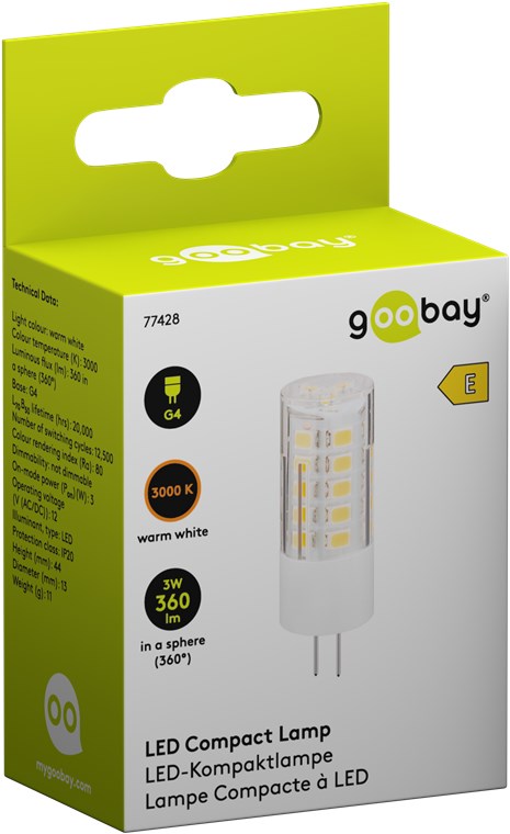 • With 360 lm and warm white 3000 K, the G4 LED lamp is the ideal light source for many lamps, including desk lamps, LED under-cabinet lights, table lamps, display cabinets and mirror cabinets