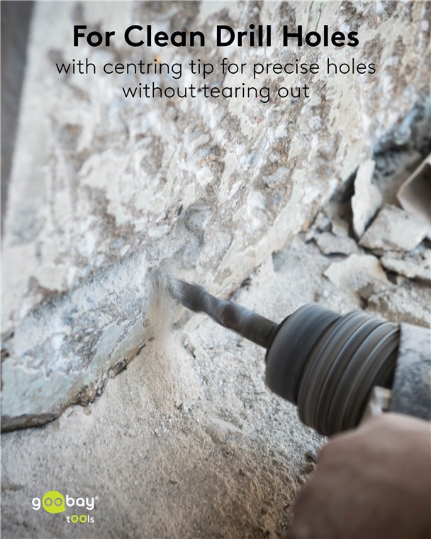 - With a centring tip for exact positioning and precise guidance when working that prevents the drill hole from tearing out