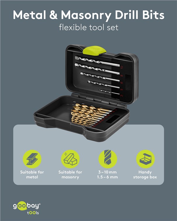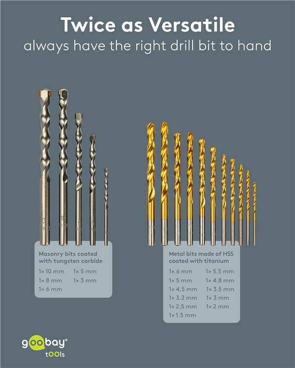 12 metal drill bits (6 mm / 5.5 mm / 5 mm / 4.8 mm / 4.5 mm / 4 mm / 3.5 mm / 3.2 mm / 3 mm / 2.5 mm / 2 mm / 1.5 mm), 5 masonry drill bits (10 mm / 8 mm / 6 mm / 5 mm / 3 mm), storage box