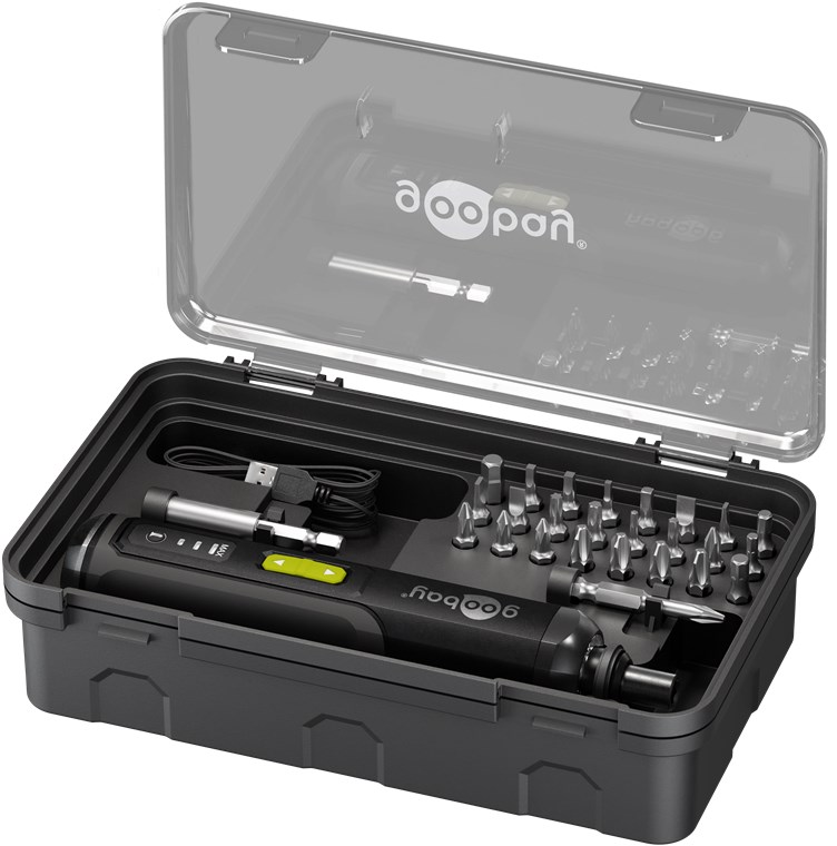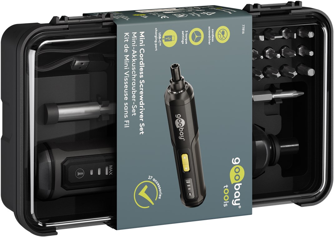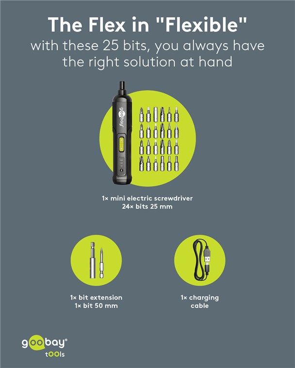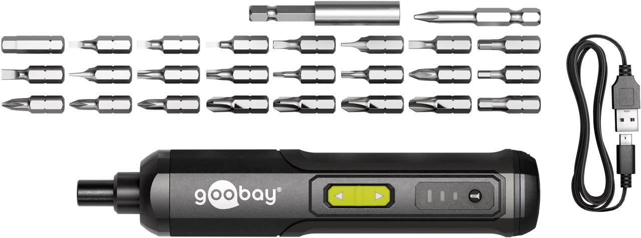 25 bits, bit extension, charging cable USB-Câ„¢ to USB-A, Cordless screwdriver, storage box