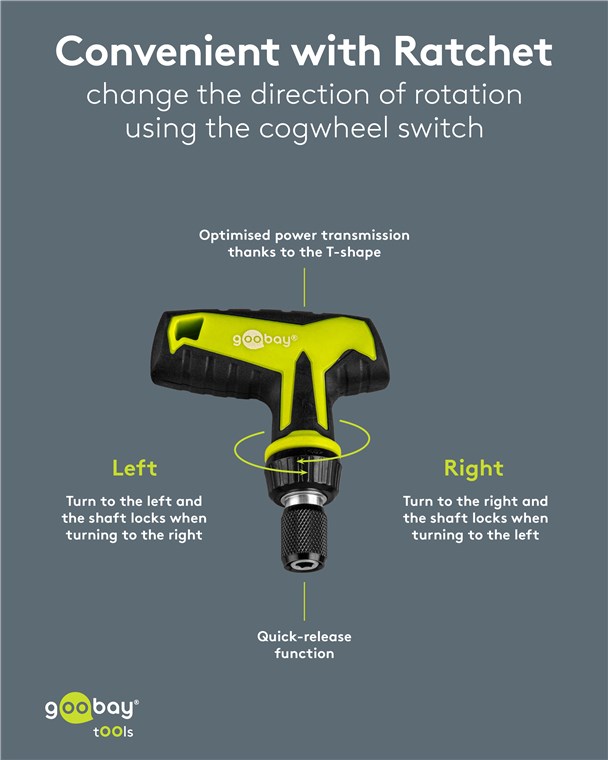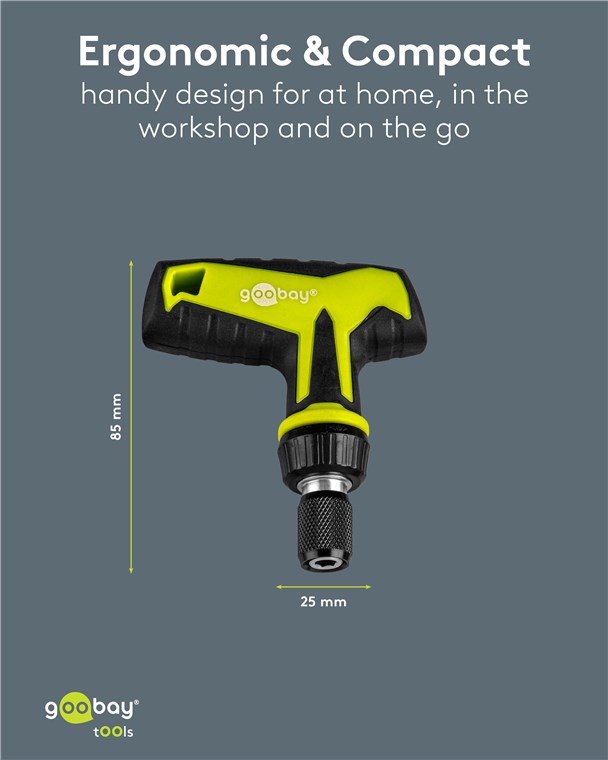 - Optimised power transmission thanks to T-ratchet: 1x T-handle ratchet with rubberised handle and quick-release function for easy bit removal, opening: 1/4 inch
