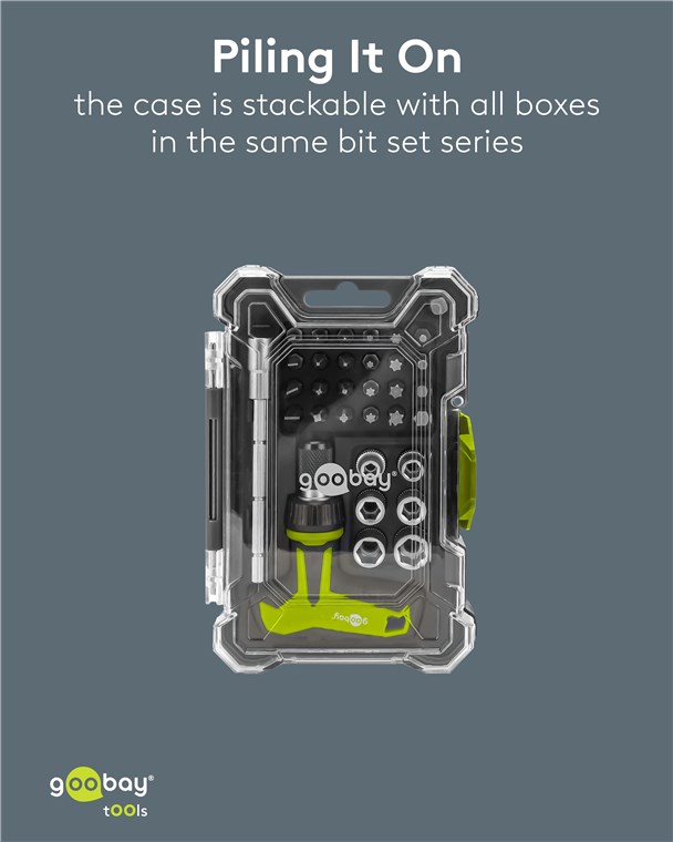 Every bit's a hit: The screwdriver set impresses with its T-bit holder, socket set and handy transport box. The T-ratchet ensures extreme comfort and optimised power transmission when screwing. The special shape with rubberised corners and a robust closure makes the box particularly resistant. The highlight: The boxes in the product series can be stacked on top of each other. Clever design, safe transport.