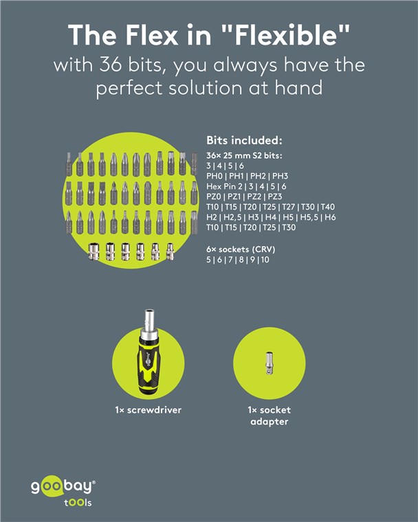 - Includes 1x socket wrench adapter, 6x sockets (5-10 mm, CRV) and 36 bits made of shock-resistant S2 steel: 4x flat, 8x cross-recess (PH, PZ), 12x hexagon (H, hex pin), 12x 6-point star (T, TH)