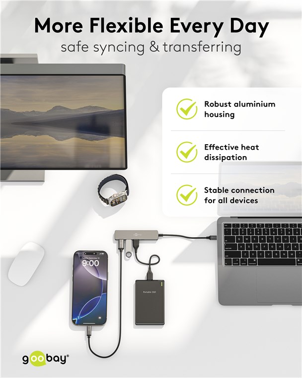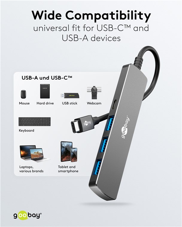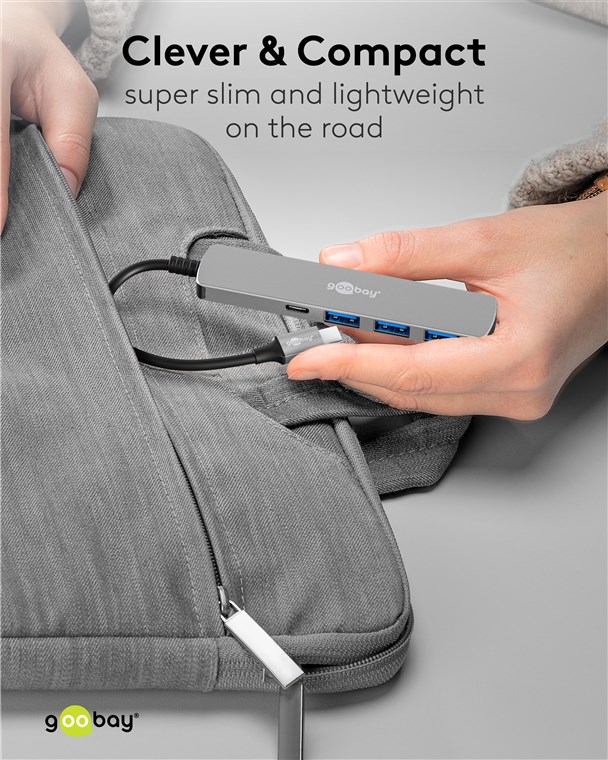 Maximum connectivity for every tablet, smartphone or laptop via just one USB-C™ port: The slim hub multiplies the connection, suitable for all USB-C™ and USB-A devices and simultaneously delivering SuperSpeed data rates via the USB 3.2 standard. No more annoying re-plugging or too few ports – the handy multiport adapter is ideally equipped for all digital challenges.