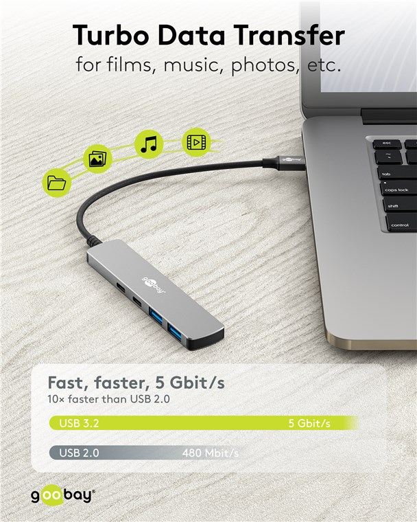 Maximum connectivity for every tablet, smartphone or laptop via just one USB-C™ port: The slim hub multiplies the connection, suitable for all USB-C™ and USB-A devices and simultaneously delivering SuperSpeed data rates via the USB 3.2 standard. No more annoying re-plugging or too few ports – the handy multiport adapter is ideally equipped for all digital challenges.