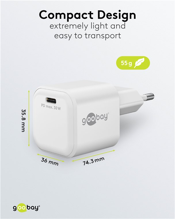 - With 30 W of power, the charging adapter is specially tailored to small devices such as smartphones, Bluetooth headphones, tablets or power banks