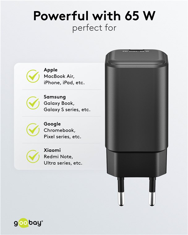 - The wall charger is compatible with smartphone brands such as Apple iPhone, Samsung, Xiaomi, LG, Huawei, and tablets such as the Apple iPad or notebooks from popular manufacturers such as Acer, HP, Fujitsu and Razer
