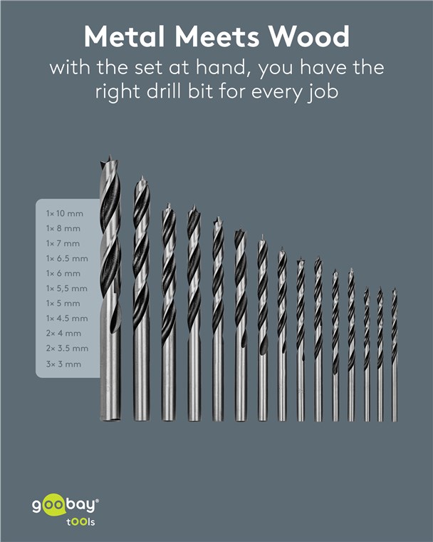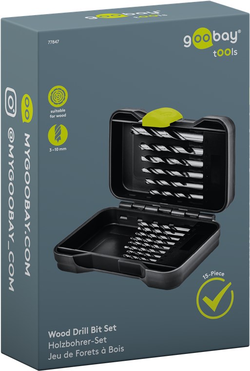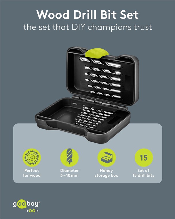 15 wood drill bits (10 mm / 8 mm / 7 mm / 6.5 mm / 6 mm / 5.5 mm / 5 mm / 4.5 mm / 2× 4 mm / 2× 3.5 mm / 3× 3 mm), storage box