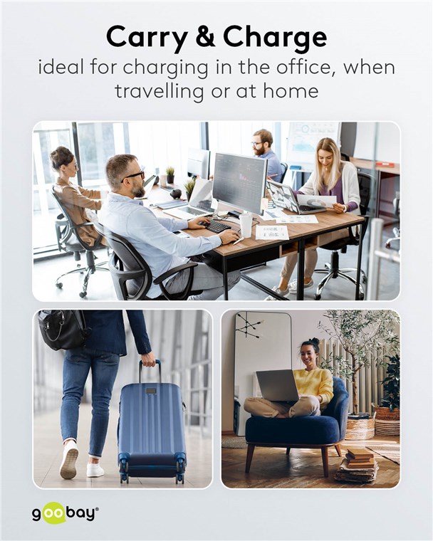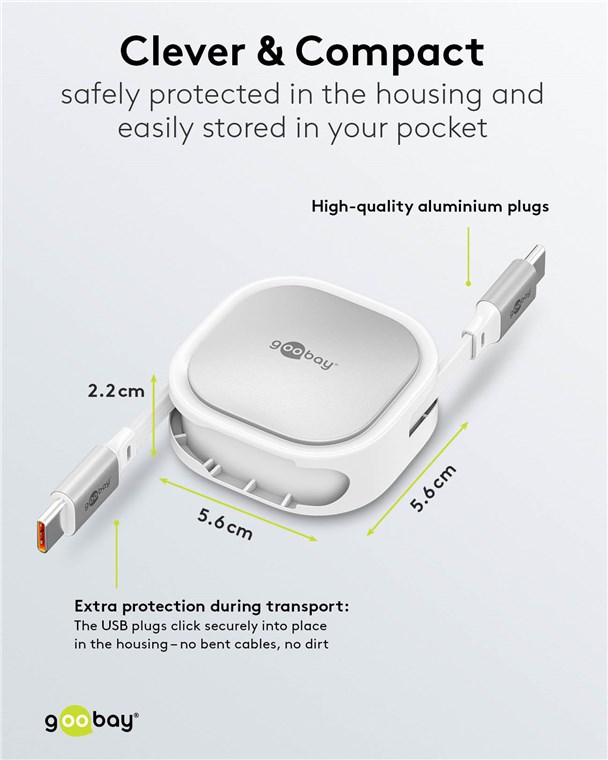 Putting the fun in function : Enrouler le câble à la main, c'est du passé, car avec le mécanisme d'enroulement intégré, le câble se rétracte automatiquement dans le boîtier. Protégé de manière optimale et enroulé de manière ultracompacte, le câble de recharge est le compagnon indispensable en déplacement – plus jamais de rupture de câble ou d'enchevêtrement dans la poche ! À peine plus grand qu'un biscuit, le boîtier tient bien en main et se glisse facilement dans toutes les poches.