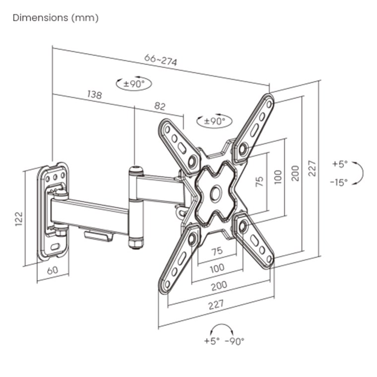- Support TV flexible pour un angle de vision optimal : Inclinable de +5° à -15° (haut/bas), pivotant de +60/-60° (gauche/droite), rotatif de +5° à -90° et extensible de 27,4 cm
