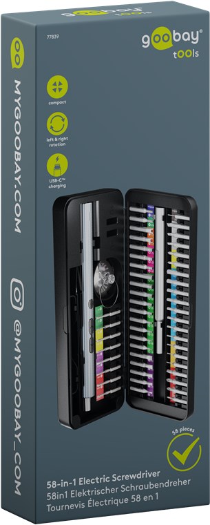 - Incl. 50 punte (28 mm, 35 mm): 8x a croce (P, PH), 11x a stella esagonale (T, TH), 9x esagonali (H), 7x a taglio piatto, 1x a 5 punte, 4x a tri-wing, 3x a triangolo, 3x a quadrato, 2x a forma U, 1x per legno (W), 1x per perni passanti